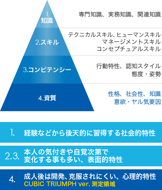 人材が職務で能力を発揮するには、知識・スキル・コンピテンシー等が必要ですが、それらの根底にあるのが資質です。